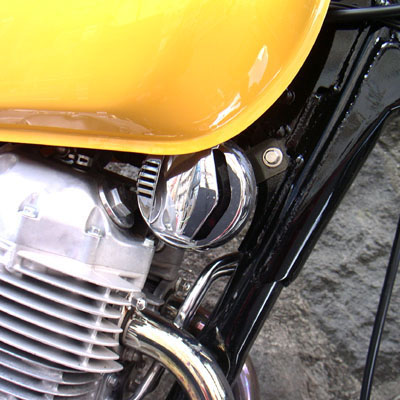 | ホーン買いました 正面から見た時どセンターにホーンが見えるのが僕には間が抜けたように感じられ気になってしょうがなかったので位置を横へずらしました、がノーマルのホーンは見た目がシンプルなうえそのままつけると向きが真横になってしまうのでGB250のホーンを流用してアクセント+正面を向く(見た目だけでも)ようにしました。 ![]() 取付けました 取付け時配線のことなどまったく頭になかったのですが2〜30cmほど長さがたりません、しかたないので適当なコードを足して延長しています、つなぎ目はめんどうなのでむき出し線をネジってビニールテープでぐるぐる巻きにしています。 気が向いたらギボシ買ってきてちゃんと止めるかも? 試しに鳴らしてみるとノーマルより気持ち音が小さいような?・・でも使用に問題があるほどではないしあんまり使う物ではないので気にしません。 |