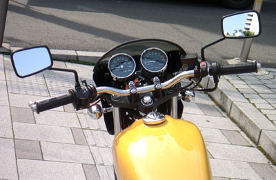 | 低くしたかったんです コンチハンドルで見た目をを低くしたのですがもっと低くしたく思い、上へ高く伸びるミラーに目をつけました。 このミラーは以前ドカM400が付けてるのみていいな〜と思って探していたものでヤマハルネッサのサイトの方に販売しているところを教えていただき取り寄せました。 ![]() テ〜マは開放感!!(謎 最初付けた時は正面から見ると低くなった変わりに今度は左右へ伸びてしまった感じがしてカッコ悪り〜とか思っていたのですが、慣れたら中々気に入りました。 以前付けていたい角ミラーより一回り小さく視野が狭まり見にくいかと思ってたのですが・・走ってみるとなぜだろう?すごく見やすいです!そしてミラーが低くなったので視界が開けたような開放感があります、低速ではブレて全く見えないともきいていたのですがどの速度でもそれなりに見えるので僕には気になりません。 そしてすり抜けがしやすいです、すり抜ける時以前はハンドル幅とミラーの位置を気にしてスリスリしていたのですが今すり抜ける時ミラーの事を考えていないことに気づきました。 ![]() ただこのタイプのミラーはみなそうなのかもしれませんがステーとミラーを固定するのがネジ一本のため少し力が加わるとクルっと回ってしまいます、そしてネジでステーに直接おさえつけてるためせっかくの黒い塗装がキズつくキズつく(涙 そのため気軽にミラーのポジションはいじれません、気にしなければいいのかもしれませんが僕そういうの凄く気になってしまうんですよ。 それとこのネジ、振動で弛んでしまいそうな気がします、そしていつか走行中にミラーとサヨナラしてしまうんでしょうか・・ 中毒的にね このミラー見やすい!カッコイイ!というような感覚では無く中毒的にクセになりました、しばらく手ばなせません(でもカウルといいこのミラーといい「品」って意味ではどんどん悪い方向へむかっているような・・あんまりカスタム感が前面に出てきてしまうのは好みでないんですよね)。 たぶんこのミラーカウル無いタイプの方が似合いそうなきがします。 |