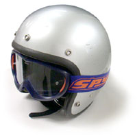 | 連れに見せたら「銀のヘルメットにクリアーブルー(濃い目の青)のフチで青帯にオレンジの抜き文字のゴムのゴーグルは変だそもそも『SPY』ってなんだ?怪しい〜」と言われてしまいました・・オークションに出品される日も遠く無いかも・・ | |||||||||||||