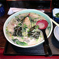 魚介類のごった煮のまん中に例の三角錐が鎮座しています・・それにしてもコノ量・・ 写真じゃ分かりづらいかもしれませんがかなり多いです。 味は・・・長崎ちゃんぽん?丼モノじゃないじゃん!!マグロ専門店だしマグロのいろんな部分が入っているんだろうけどわからなかった、でも美味しかった〜よ(半分くらいでよかったけど)。 |