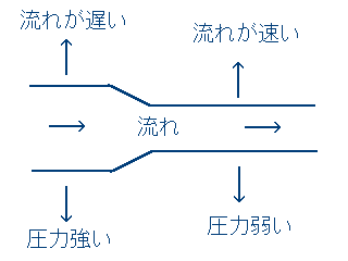 なんつーことはない話ですな。遅い流れは速い流れより、遅い分だけ強く横へ広がろうとする、ってだけの話です。空気の流れでも、水の流れでも。 しかしこの「流れの速さが変わると圧力に差が生じる」ことが、飛行機の主翼を持ち上げ、飛行(浮上)を可能にするんですねこれが。 ![]()
