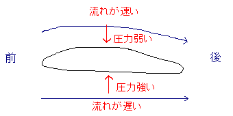 御覧の通り、飛行機の主翼は普通、上下で異なる曲率のカーブを描くように、偏った膨らみを持って作られます。翼の上の方が、下よりも曲率が高いのです。この結果、主翼の上と下では、表面の弧の長さの違いによって前後長が異なるという事態が生じます。翼の上の方が、下の方よりも表面の長さが長いのです。 するとどうなるか? ![]() 翼の上を通る空気流は下よりも速くなり、翼の下を通る空気流は上よりも遅くなる。 さて、どうでしょう(←ネタがふるい) ![]() するとどうなるか? 押し下げに勝る押し上げの圧力によって、飛行機の翼は、上に向かって浮き上がっていく。 飛ぶわけです。 この、空気の流体圧力の速度差による「浮き上がる力」、<揚力>は、翼の移動速度が速ければ速いほど大きくなります。翼が非常に速い速度で移動すると、この揚力が、翼(とそれを持つもの、飛行機)を下に押しつけている重力の力にうち勝つようになり、結果飛行機は、重力よりも強い力に支えられて空に舞い上がるのだ、とこーゆーわけ、なのだそうです。 こうして飛行機は飛ぶことが出来るのだ、ということなんだそうですわよ、奥様。 (↑実はよくわかっていないので自信がない)
