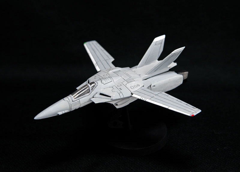 そんなこんなで塗装を済ませ、20年間放置したアリイの1/100 ファイター・バルキリー、完成です。アクリル・ガッシュの白、ニュートラル・グレー2色、それに水性ホビーカラー黒鉄色の下手な筆塗り。 こういう塗装が実在するわけではありませんが、存在感からアニメっぽさが消え、そこに実際にあるような 模型的なリアリティを出すことに成功(自画自賛)。それも現用機のような無機質さではなく、微妙にアニメ的なヒロイズムを残すことに成功したのが嬉しいポイントです(自画自賛)。 ![]()