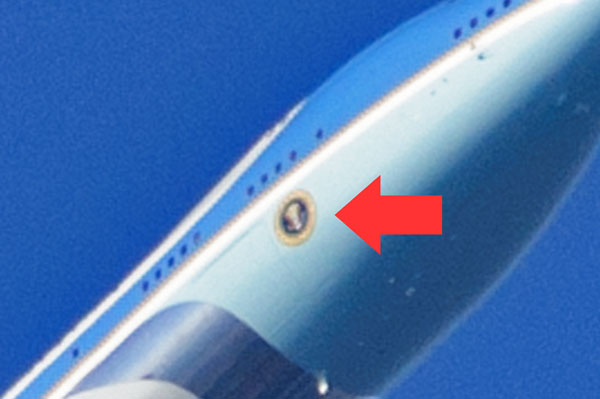 こんな飛行機は通りがかったことがない。 バシャバシャ撮って見送ってから、画像を確認してみると、見慣れない特徴が散見されます。 垂直尾翼のアメリカ国旗。