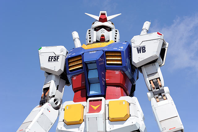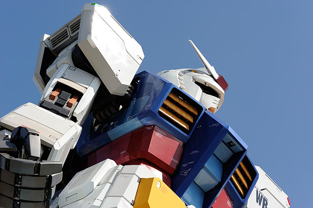 「こちらです」。 それはそうなんですけど、「こちらです」とか云われるとスゲェ違和感が。 そりゃまぁ、実にまっとうな案内だとは思うが、モノがモビル・スーツだけに「こちらです」とかどうなんでしょうか。 モビル・スーツですよ? 「連邦のモビル・スーツは化け物か!」のモビル・スーツですよ? 「こちらです」とかアッサリ案内されちゃっていーんですかそうですか。いいんですけど。 微妙な疑問を胸の内深く沈めながら、大量の見物客に混じって駅を降り、人の波についてゆくと海沿いの公園に案内されて、なにか突き放されたように海に出てしまう。 ? あのヒトはどこ? ヒトじゃないけど。 と不思議に思ってすたすた歩いてゆくと、木の陰から、ひょいと出現した。
