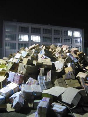 一方の内壁部分は、高く積み上げられたダンボールをとるところから作業が始まります。ダンボールがとれ、机が見えてきたら、机同士、机とビールケースを結んでいたスズランテープを切り、ばらばらにして、それぞれ出口方面へ集めます。