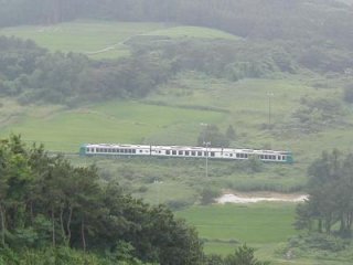 さて、前ページで触れたリゾートしらかみ号の蜃気楼ダイヤですが、 この展望台にいる時間帯が、ちょうどバック運行中と重なっていたようです。 そのレール音と汽笛が、なんと展望台まで響いてきました。 展望台から目撃した写真がこれです。