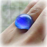 こんな感じに仕上がりました。 指輪は二種類作りました。ひとつは、下に流れたタイプ(左の列)、 もうひとつは丸形(右の列)です。 冷たい感じは左かなと思います。こちらはプラチナを閉じこめてあります。 銀よりも冷たく鋭い感じのきらめきです。