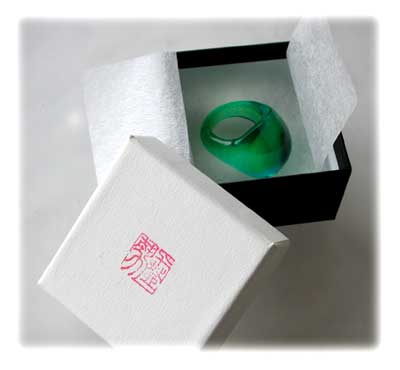 標準のタント紙の貼り箱です。無料です。 高さが4.5pあります。 中には綿と和紙、蓋はアイボリーホワイト、本体はマットな黒です。 蓋には作者の篆刻印がおしてあります。 ポストに入らないから、という場合は、もっとちいさな丸い透明プラスチックの簡易ケースにもできます。 |