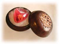 木の手作りの丸いリングケースです。蓋の上部には竹で編んだ この丸いケースを紙のはり箱に入れてお届けします。 |