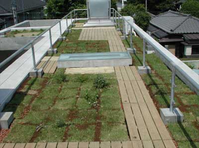 5月19日 芝生:植え付けから一週間後 目土がだいぶ水やりによって流れてしまいました。 徐々に緑のはっぱが伸びています。 草花はポーチュラカ(松葉ぼたんの仲間)が 元気です。しかし、今日芝生栽培の本を買って読んだところ、 花と芝生をいっしょに植えるのは あまりよろしくないことがわかり、 近日中に花のエリアと芝生のエリアを 分ける予定です