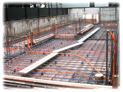 2000年12月16日 おうち建設中!建築現場より 今日は今建設中の新居の様子を見に行きました。コンクリート打ち放し、周囲を壁で囲んですっぽりとプライベート空間に住む、都会の暮らし向きの設計です。特徴のひとつには「バリアフリー」があります。とてもモダンなデザインですが、車椅子でも生活できるようになっています。これは父が車椅子なせいもありますが、将来のことを考えて、長く自立して暮らせるようにといろいろ勉強しました。道路から全く段差がありません。思い切ってホームエレベーターもつけました。 8月から施工に入ったのですが、やっともうすぐ1階の壁と天井のコンクリートを打つという状況!遅れに遅れています。 下は、10月21日の写真です。地下のコンクリートを打ち終わって1階に鉄筋を組んでいるところです。