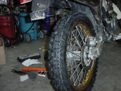 タイヤ交換が終わったらチェーン調整です。 チェーンのたるみを調節したら チェーンとスプロケの間にドライバー等を 挟んでチェーンを張ると アクスルシャフトが前に押さえられ しっかりとガタが無く アクスルシャフトをとめられます。 |