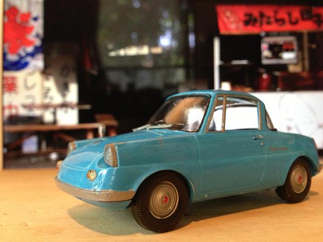マツダクーペ360、バックはおもちゃみたいだけど、名古屋に行ったときにとった写真。 ノートPCのキーボードの上にマナイタを乗せました。 |