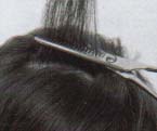 マジックテープで髪をはさみ力ットする方法。パネルを引き出してマジック・テープではさむだけで、自然にアップステムができる。